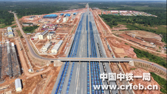 项目建设期间,在赢联盟西芒杜铁路公司精心组织下,项目部围绕节点任务目标,各参建单位紧密配合,积极开展各阶段专项劳动竞赛活动,持续掀起施工大干高潮。架梁施工克服雨季有效作业时间短、连续高墩桥占比多、全线最长桥施工周期长、桥梁运输安全风险高等挑战,采取分段推进、集中攻坚作业模式,投入使用两台架桥机进行双机双架。投入建设两个标准化梁场,日架梁最高突破30片,顺利于5月19日完成全部架梁任务,实现全线架梁贯通。项目部投入建设了“非洲首条智能化焊轨生产线”,采用“拖拉法”机械化铺设长轨,并创新开发了邻线“反拖拉铺轨法”,将铺轨效率提升了一倍,最高日铺轨10.8公里,于6月30日圆满完成正线全部铺轨施工任务,实现正线轨道铺设全线贯通,顺利兑现国务院国资委和全国工商联下达的标准轨贯通重大节点目标,为CTG铁路按期建成通车奠定了坚实基础。
