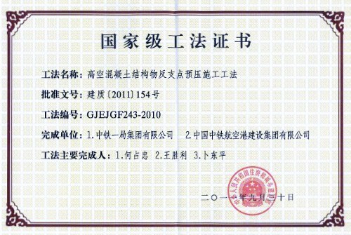 由我公司完成的“高空混凝土结构物反支点预压施工工法”被评为国家级工法。