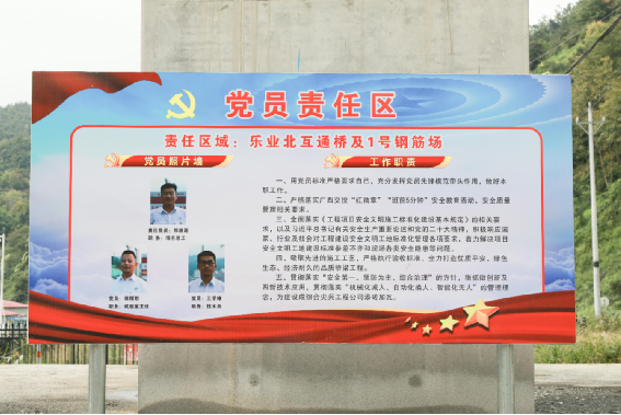 走进乐业北互通桥施工区域,一块偌大的“党员安全责任区”告示牌竖立眼前,以党员骨干为核心,青年团员为主力的红色力量为施工安全保驾护航。