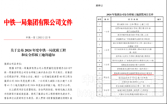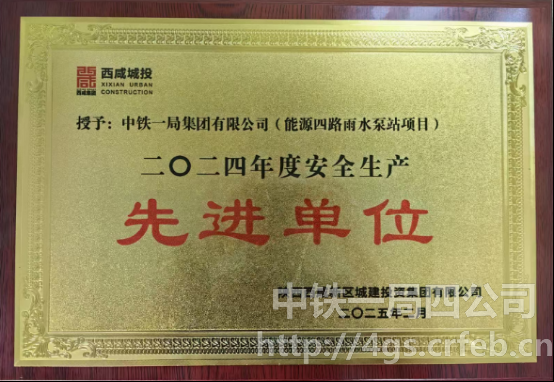 近日,公司能源四路雨水泵站项目荣获陕西省西咸新区城建投资集团“2024年度安全生产先进单位”及中铁一局“2024年度安全样板工地”称号。