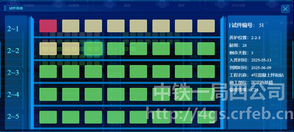 试件检测、智能预警。为了提升试验检测工作效率,确保工程实体质量,项目部推广应用标养室智能预警系统。该系统不只是简单的温湿度数据,还包括试件对应的施工部位、存放位置、养护龄期等完整信息。当试件达到检测龄期时,系统会通过颜色变化和语音播报进行双重提醒。这套智能养护系统降低了试件养护过程中的人为失误风险,为工程质量控制提供了有力保障。