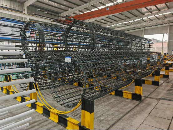 钢筋笼生产线按照“原材料存放区→上料区→钢筋下料区→加强圈制作区→钢筋笼焊接区→钢筋笼加焊区→堆码打包”布置。主要由数控钢筋剪切机、数控弯圆机和数控钢筋笼滚焊机组成生产线。