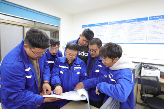 张亚会(左三)与项目工程部技术员共同讨论施工难题——王利摄