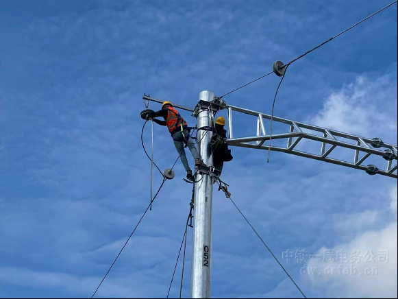 技术员宋珂最后一次检查各工序材料准备情况,并核对展放线索的型号与长度。接触网队长邹虎坦言:“现场交叉施工单位多、大型机械密集,且拨接线索超一半位于既有线区域,放线车无法进入,全靠人工拉线架设,施工难度大,对放线影响显著。”有着多年施工经验的他并未退缩,天窗点施工前,便带领数十名网工利用III级不封锁计划,将承导线提前从工程线展放至既有拨接口网外,并将承力索绕“8”字摆放预留,为天窗点施工争取了充足时间。