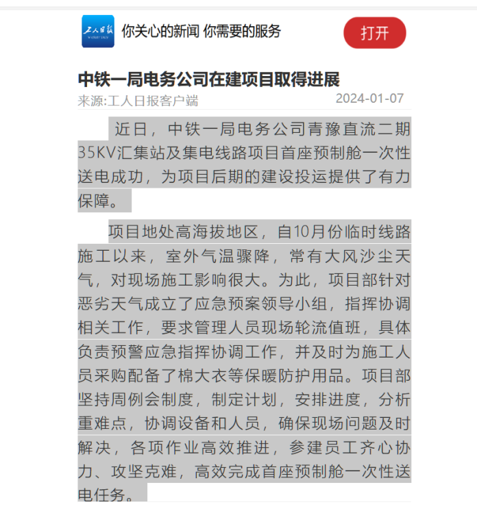 【工人日报】中铁一局电务公司在建项目取得进展