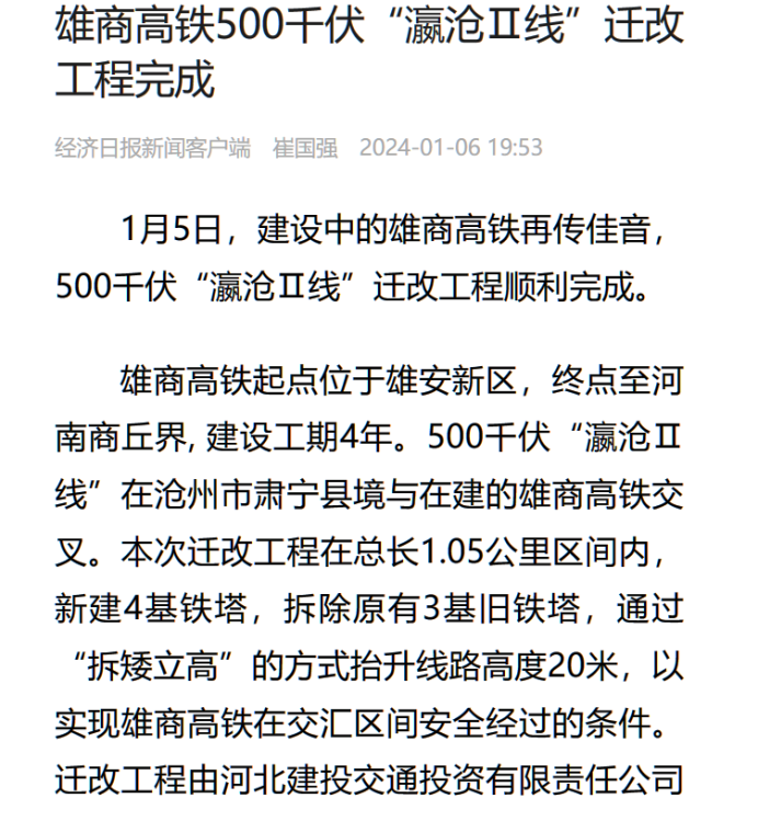 【经济日报】雄商高铁500千伏“瀛沧Ⅱ线”迁改工程完成