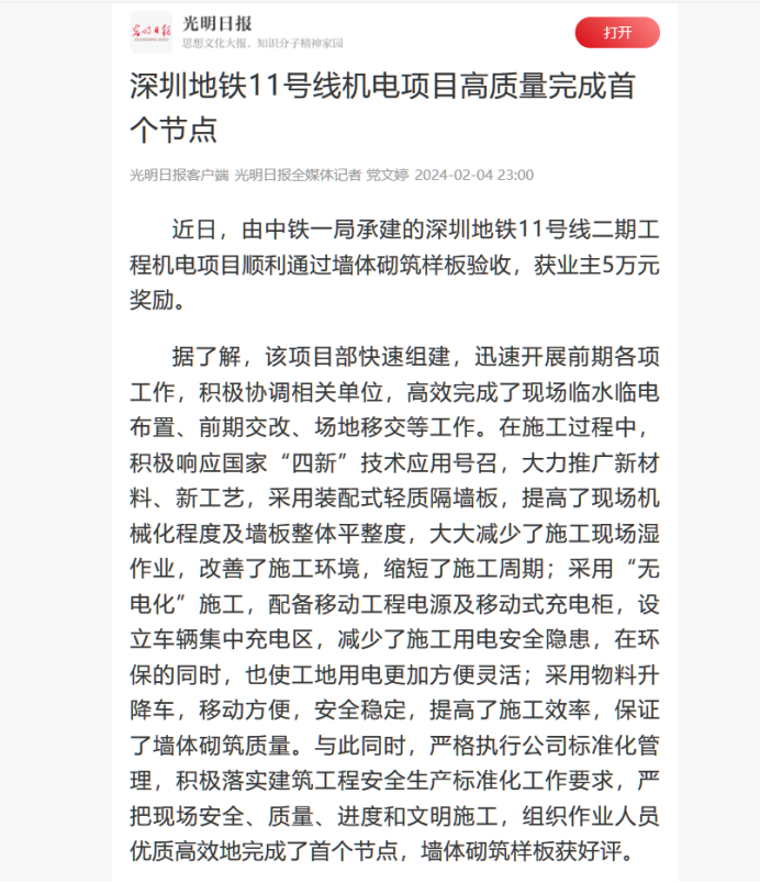 近日,由中铁一局承建的深圳地铁11号线二期工程机电项目顺利通过墙体砌筑样板验收,获业主5万元奖励。