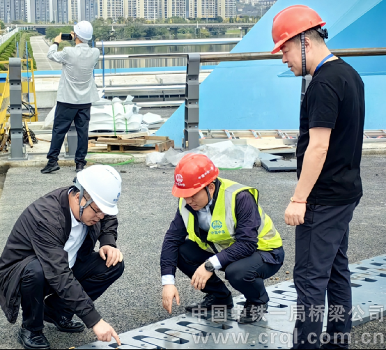 何炯伟一行深入项目现场,对当前工程进展给予充分肯定。他指出,当前项目已进入竣工冲刺的关键阶段,必须严守安全生产红线,切实加强人员安全管理,落实临边防护措施,严防外来人员误入施工区域;要严格把控主桥桥面新材料应用质量,确保沥青路面各项指标符合规范要求;同时注重桥面吊杆与整体桥面颜色的协调统一,着力打造彰显城市形象的亮点工程。何炯伟特别强调,桥梁伸缩缝施工质量直接关系到后续运营安全和行车舒适度,项目务必高度重视,确保在2025年12月底前全面完成施工任务。