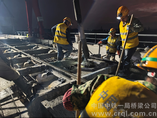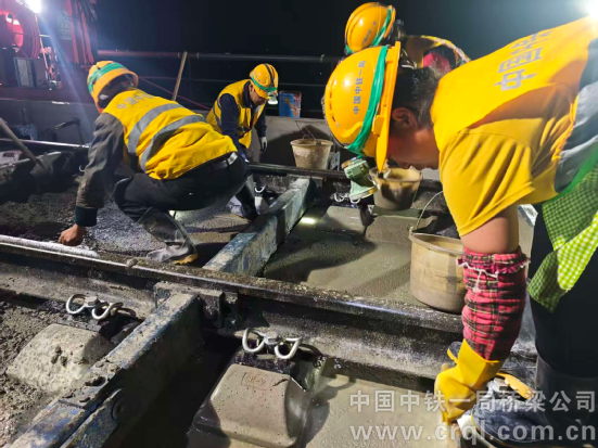 为确保施工质量安全,项目部提前组织人员勘察现场,针对长轨件吊装、精准定位、混凝土浇筑等关键环节制定专项施工方案。施工过程中,技术团队严格把控测量精度,采用专业设备将道岔安装与轨距误差控制在毫米级,并在现场人员的协调配合下分六次完成209余方混凝土浇筑及交叉作业衔接等工序,为后续铺轨奠定了坚实基础。