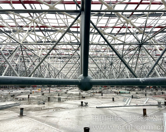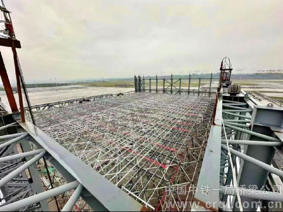 维修机库飞机维修大厅屋盖结构采用三层斜放四角锥钢网架,机库大门处屋盖采用焊接箱型截面钢桁架,跨度119米,进深93米,采用“三边支撑、临机坪侧开敞”设计,形成超过1万平方米的中间无柱大空间。此类大跨度钢网架施工在中铁一局的建设中较为罕见,网架安装采用整体提升施工方案,总提升重量超过1800吨。该项目的成功实施,为中铁一局后续承接超大吨位、大跨度钢网架工程提供了重要实践依据,也将有力推动中铁一局在超大吨位、大跨度钢网架整体提升施工技术方面的持续发展。
