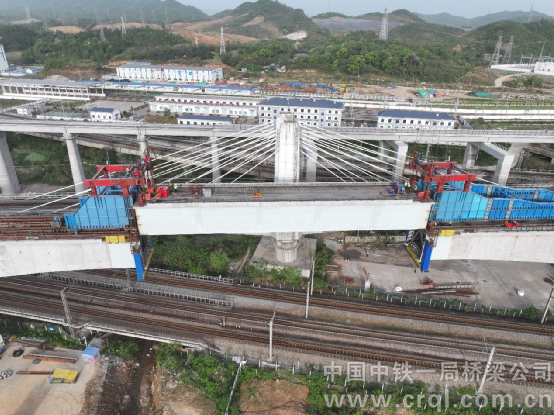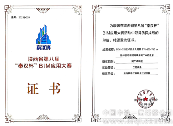 施工中19次跨越铁路、高速与水库,每一次跨越都是对技术与安全管控的严峻考验。跨杭瑞高速特大桥施工中,创新采用国内首创的“自驱动轮轨式小车大纵坡驮运纵移+竖向千斤顶吊挂系统整体下放”工法,以16台小车组成“运输矩阵”完成过孔作业,借BIM技术实现钢箱梁误差毫米级控制,工效较传统工法提升10倍,相关BIM应用成果荣获“新城建杯”一等奖、“秦汉杯”二类成果奖,为同类工程提供宝贵经验。