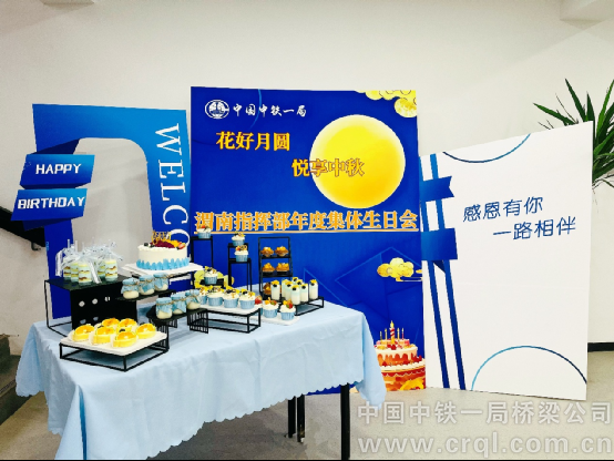 活动现场,指挥部被缤纷的气球与精美的蛋糕装点得格外温馨。“花好月圆、悦享中秋”与“集体生日会”的主题标语交相辉映,营造出浓厚的节日氛围与集体欢庆的喜悦。
