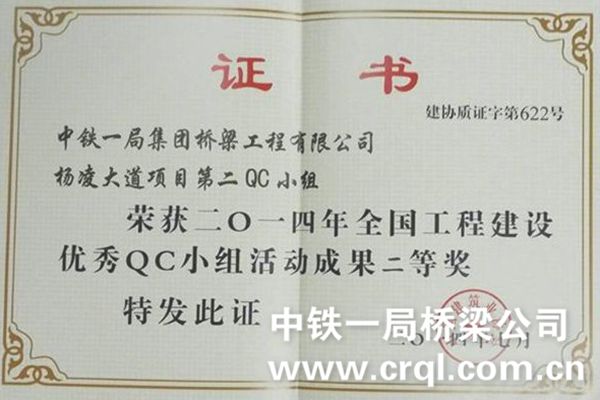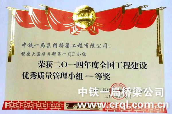2014年度全国工程建设质量管理小组代表会及全国工程建设优秀质量管理小组活动成果交流会分别在昆明、厦门两地举行,杨凌项目部工程部长王博代表中铁一局桥梁公司杨凌大道项目部出席了交流会。项目部两成果《提高12000T型钢悬臂箱梁转体桥球铰安装精度》和《缩短钻孔桩桩头凿除施工时间》分别荣获一等奖、二等奖。