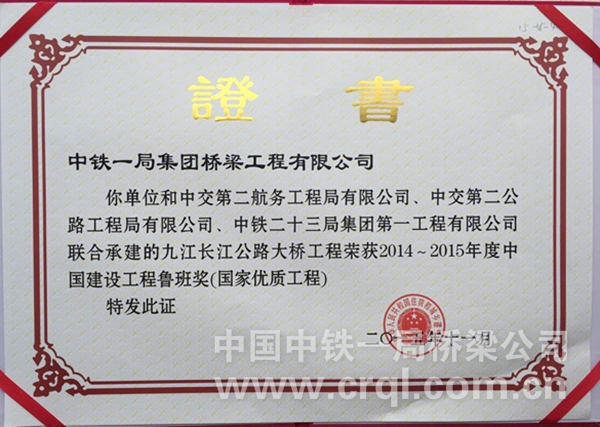 2015年11月17日上午,由首都北京传来了令人振奋的消息,在2014-2015年度中国建设工程鲁班奖(国家优质工程)经验交流表彰大会的现场,由中铁一局集团桥梁工程有限公司承建的九江长江公路大桥荣获中国建筑行业工程质量最高荣誉鲁班奖。桥梁公司安全总监高虎军和九江长江公路大桥项目经理赵云峰出席了本次颁奖典礼,并从颁奖现场发回获奖盛况。