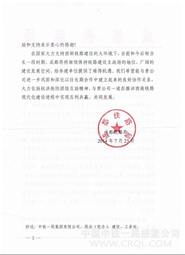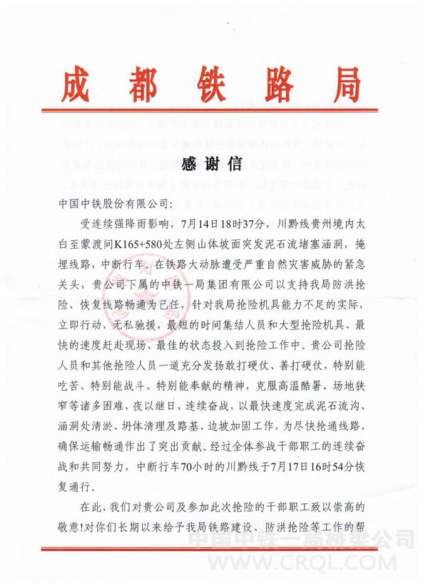 7月23日,成都铁路局发了感谢信,赞扬中铁一局在铁路建设、川黔铁路受灾抢险等各方面作出了突出贡献。
