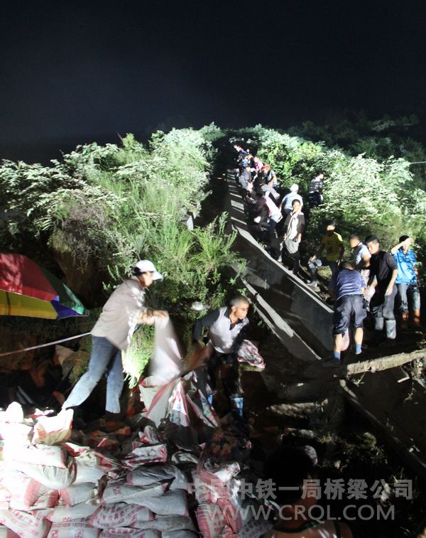 一声号令,快速集结,一局桥梁人不畏艰险,突击抢险战役由14日晚的110名开始,15日达到500多名,投入大型机械设备29台,中铁一局抢险队员连续三天三夜没睡觉,始终奋战在最危险的一线,运输物资、抢修便道、清淤排障,砌筑挡护墙,累计清除淤积物12000余立方米。经过铁路局各级领导及地方政府科学决策指挥,抢险人员持续忘我生命投入抢险及沿线群众群策群力,川黔铁路桐梓到綦江段受灾线路终于在最短的时间内恢复了通行。