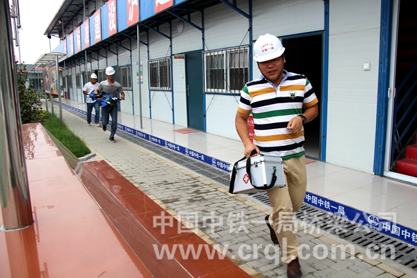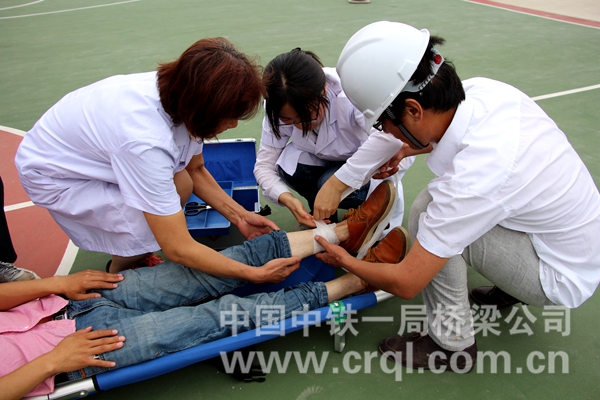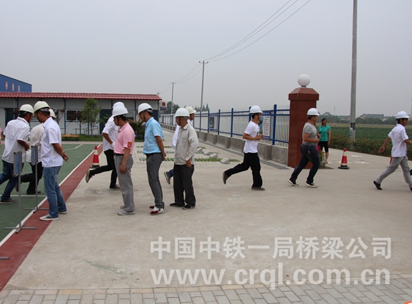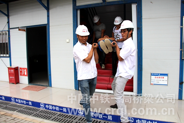 此次演练共分疏散组、警戒组、急救组、抢险组、物资保障组、房屋加固组和事故调查组七个组。首先,电工拉闸断电,同时,警戒组疏散二楼人员并布设警戒路线。接着,物资保障组和抢险组分别抢救应急器材和重要的仪器设备。警戒组继续排查二楼各个房间,“报告指挥,二楼发现伤员一名”,急救组迅速上楼,用担架将伤员抬下楼,紧接着急救车也赶到现场,对伤员进行简单的包扎后,将其送往医院。待二楼人员撤离完毕后,警戒组开始在楼上扔钢丝绳,房屋加固组在楼下接应,将钢丝绳与预埋的地锚连接在一起,对二楼房屋进行加固。所有人员集合完毕后,现场指挥进行人员清点,所有人员沿逃生通道撤离到箱梁梁体内避险。