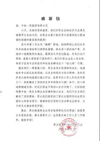 近日,中铁一局接连收到两份特殊的“礼物”:蓉江新区项目部收到潭东镇博罗村委会送来的锦旗与感谢信,大上崇项目获社溪镇麻田村委会赠予的锦旗。这两面锦旗与感谢信,既是村民对项目团队工作的肯定,更是对公司践行社会责任、心系群众需求的高度认可。