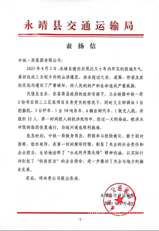 8月4日,中铁一局集团兰合铁路项目三工区收到永靖县交通运输局表扬信,对项目在极端灾情面前挺身而出、主动担当的铁军精神给予高度肯定,称赞项目以实际行动深化了企地融合发展,为地方抢险救灾工作作出重要贡献。