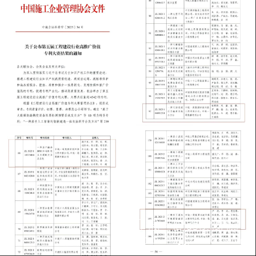 公司三项专利成果荣获中国施工企业管理协会高推广价值专利