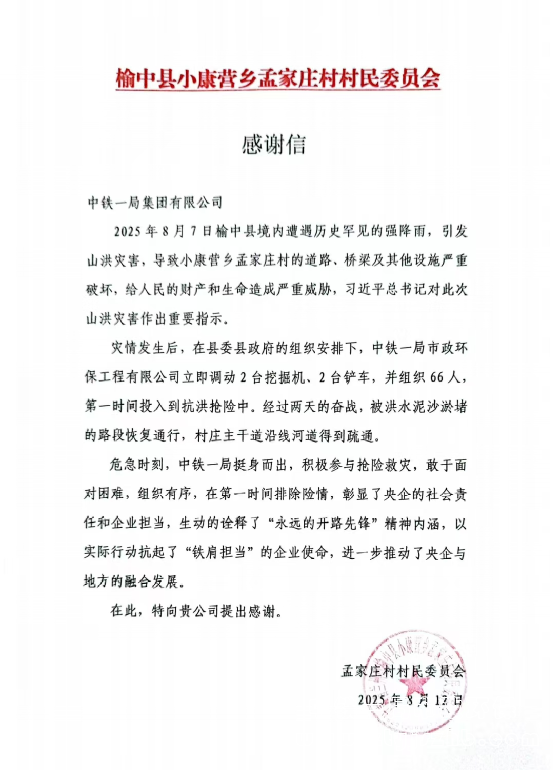 8月13日,中铁一局市政环保公司历经3天的奋战,顺利完成榆中县小康营乡孟家庄村的道路清淤,公司承接的榆中县抢险救灾第一阶段道路抢通任务也宣告完成。孟家庄村村民委员会特赠送锦旗并发感谢信,感谢中铁一局挺身而出,积极参与抢险救灾,生动诠释“永远的开路先锋”精神内涵,扛起“铁肩担当”的企业使命。