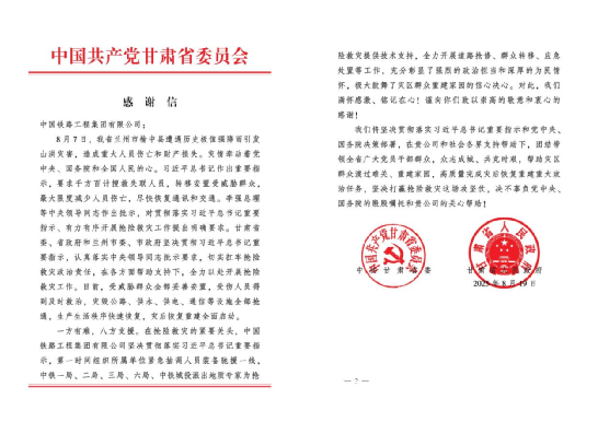 近日,中共甘肃省委在致中国铁路工程集团有限公司的感谢信中,特别提及并肯定了中铁一局在此次救灾中的突出贡献,称赞其用实际行动诠释了“一方有难、八方支援”的精神,彰显了强烈的政治担当与深厚的为民情怀。