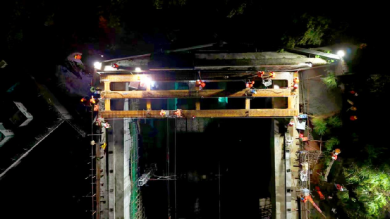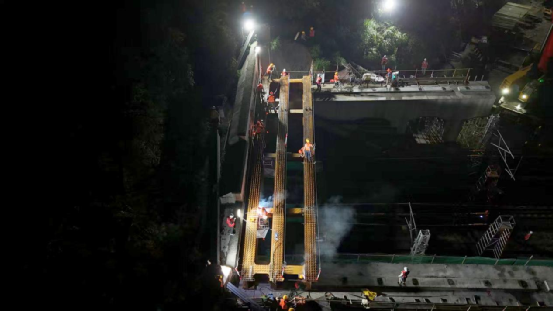 8月12日晚8点,在立秋后的第一场雨中,随着第一组钢梁精准落位,公司钢结构制造分公司以72小时的极限速度,顺利完成渝怀线隧道明棚洞改造工程首批架梁任务,打赢了“8.11天窗点”旗号岭隧道施工攻坚战。