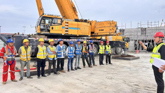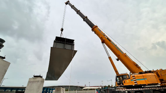 在工程推进中,作业点左侧紧邻机场运营中的交通要道,右侧为施工便道,场地狭小、环境复杂。为保障作业万无一失,施工团队以“精细化管控”为核心,结合现场实际反复推演吊装方案,对设备选型、吊点设置、应急预案等环节逐一优化;施工期间实时跟进节点进度,从构件进场检验到吊装精度校准,每一步均落实质量与安全双管控,实现首节段几乎零偏差安装。