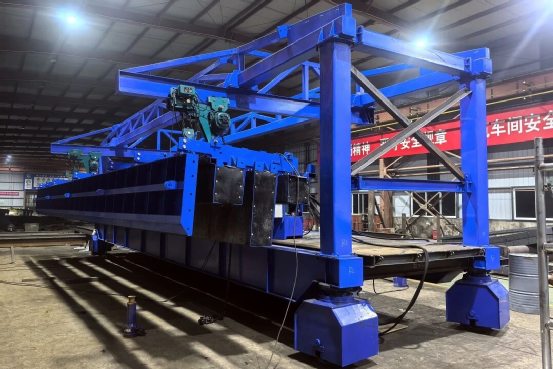 公司自主研发制作的首台一架多模单侧液压沟槽模板台车完成试拼装